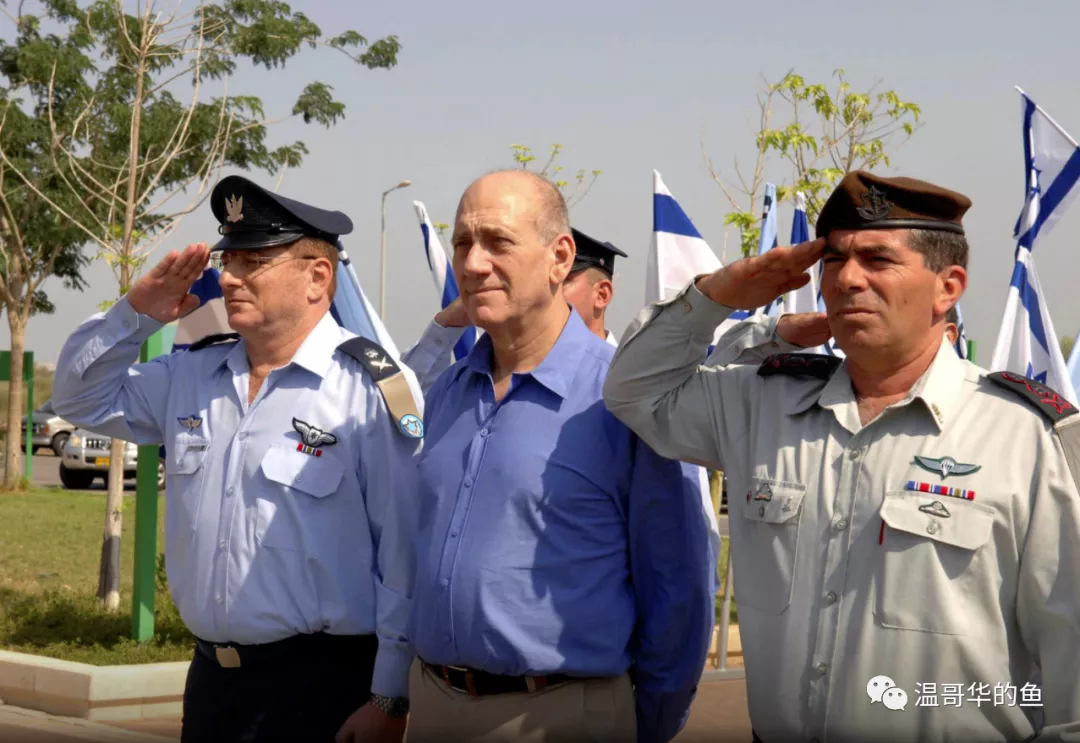 > 2007年10月16日參觀一處導彈基地的總理奧爾默特(中)、總參謀長阿什肯納茲(右)和空軍司令謝克迪(左)