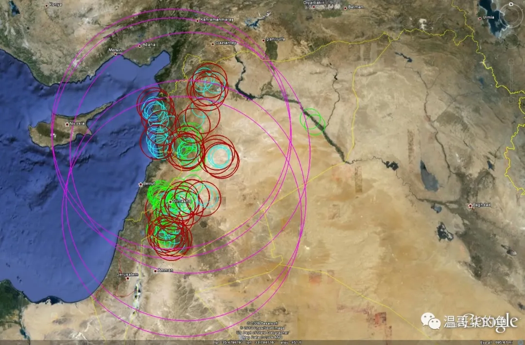 > 敍利亞主要防空系統覆蓋範圍,紅圈為薩姆-2,藍圈為薩姆-3,紫圈為薩姆-5,綠圈為薩姆-6