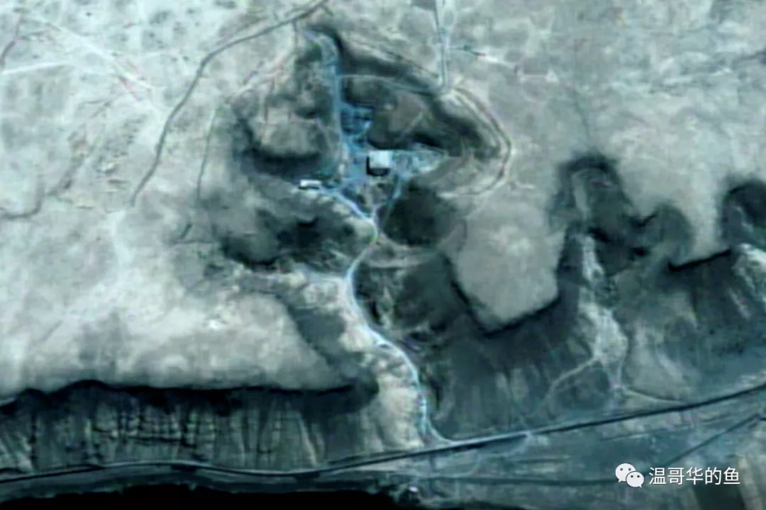 > 齊巴地區沙漠中的疑似核設施衞星圖像,距離幼發拉底河直線距離1公里,河邊建有泵站用於抽水冷卻