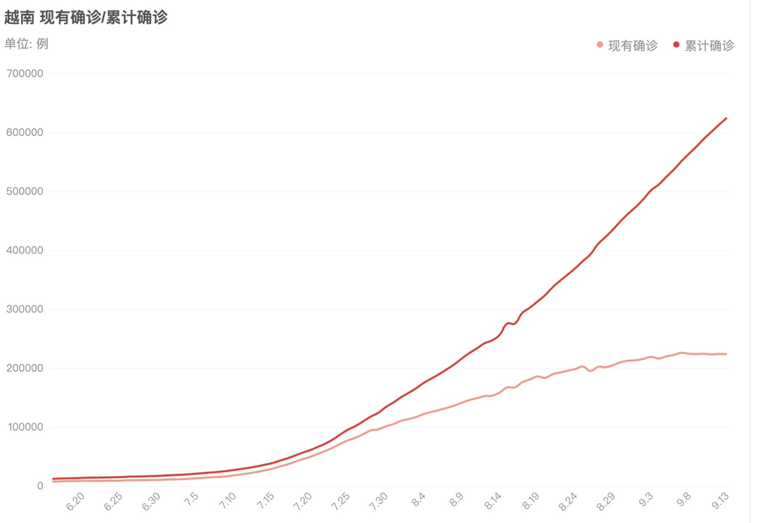 你們看看越南的累積確診人數,直線一樣飆升。