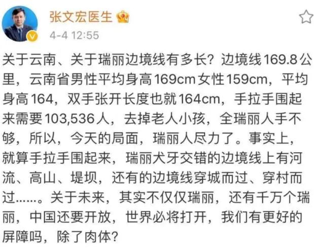 張文宏醫生對於瑞麗的防疫難度有一段經典描述,大致意思就是,除去老人和小孩,把瑞麗全部的人口拉過來,也沒辦法把國境線完全封住。