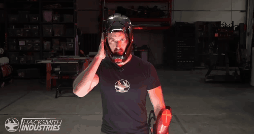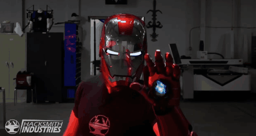 在暗紅色面具和手套之前,他們就已經做出過一個能切開 2.5 釐米鋼板的金屬手套,一個自帶平視顯示器的金屬鋼鐵俠頭盔,還有一個帶電的弧反應堆。