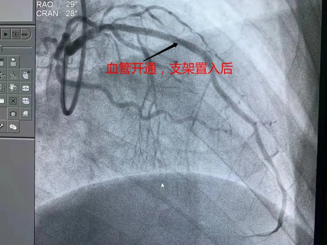 這是非常粗大的前降支血管開通,支架置入後的影像。