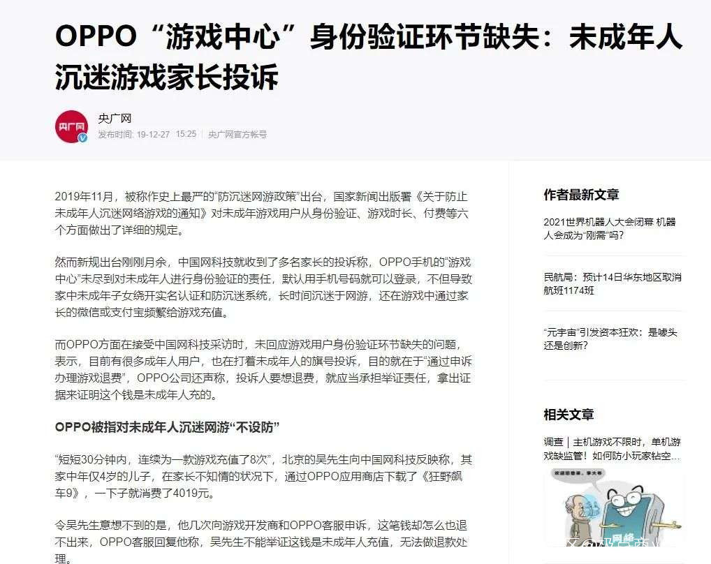 除了vivo,華為、小米手機、vivo兄弟品牌OPPO也被頻頻曝出存在類似問題。2019年,中國網科技報道稱,OPPO手機“遊戲中心”未盡到對未成年人進行身份驗證責任,默認用手機號碼就可以登錄,導致家中未成年子女繞開實名認證和防沉迷系統,頻繁給遊戲充值。