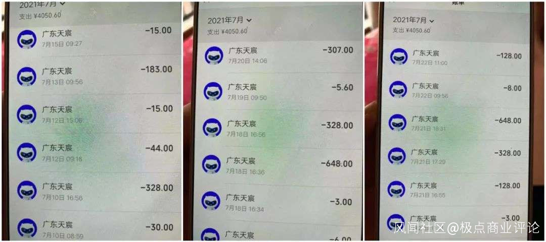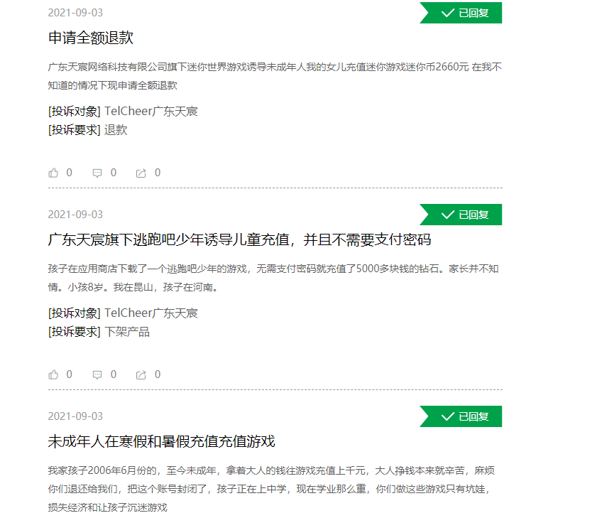 9月5日,一位用户就投訴稱,孩子奶奶年邁沒有及時看消費記錄和看賬單習慣,孩子在家偷玩手機遊戲氪金,扣款方是廣東天辰王牌競速,“交易次數頻繁,一分鐘進行一次,半小時多次充值共計3100元。”