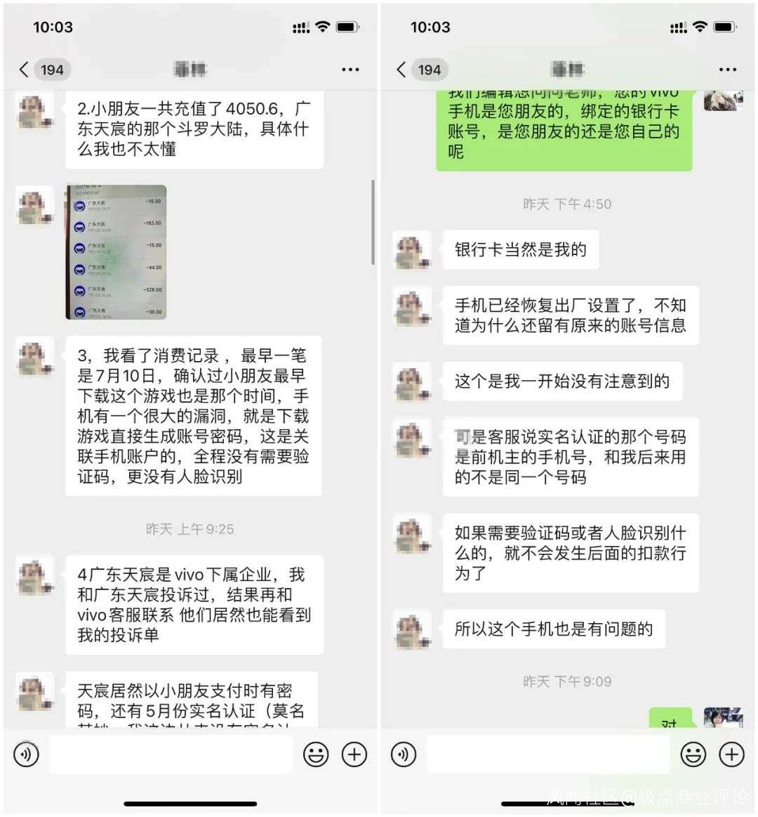 9月13日,“菲林”向“極點商業”反饋稱,今年7月她給放暑假孩子一個二手vivo手機,意想不到的是,10歲孩子在vivo手機遊戲商城下載了一款名為“斗羅大陸”的手遊,十多天內,在沒有實名認證、人臉識別認證情況下,一共充值消費4050.6元。