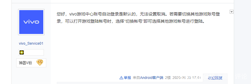 對這一點,“vivo_Service01”曾在2020年6月30日,回覆網友“如何取消vivo遊戲中心賬號自動登錄”問題時明確表示:vivo遊戲中心賬號自動登錄是默認的,無法設置取消。“vivo_Service01”為vivo貼吧官方客服,目前發帖16.7萬,都是與vivo相關內容。