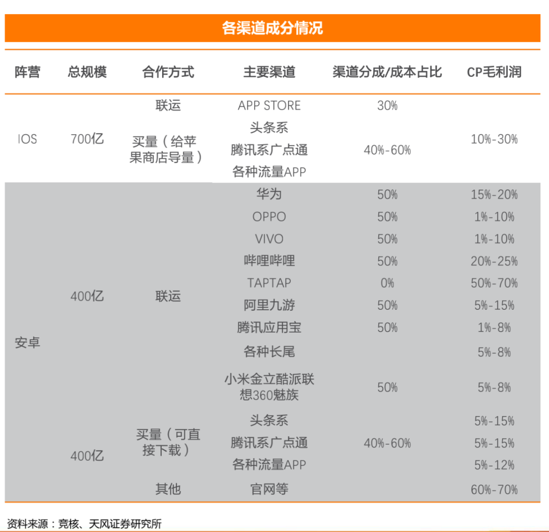 “一款遊戲所獲得收入主要被遊戲研發商、發行商、以及分發渠道所瓜分。”一位遊戲業內人士就表示,除了蘋果手機,使用手機自帶應用商店下載的遊戲,都基本屬於渠道服。比如華為、小米、OV應用商店,都是屬於渠道服。