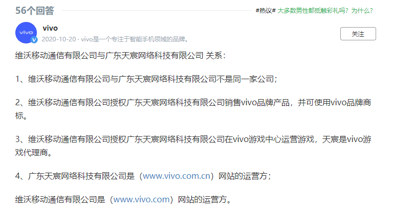 根據vivo官方認證號在百度知道的回覆,維沃移動通信有限公司(vivo)授權廣東天宸銷售vivo品牌產品,並可使用vivo品牌商標。授權廣東天宸在vivo遊戲中心運營遊戲,天宸是vivo遊戲代理商。同時,廣東天宸是(vivo.com.cn)官方網站運營方。