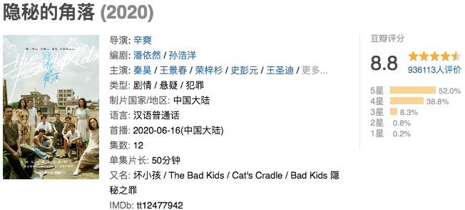 2020年的夏季,一部豆瓣開分高達9.2高分的國產懸疑網劇《隱秘的角落》,徹底點燃觀眾對該類型題材的渴望。隨後,該平台方愛奇藝,順勢推出該劇場(迷霧劇場)其他作品,但遺憾的是,口碑真正達到《隱秘的角落》的作品,僅白宇領銜主演的《沉默的真相》——而後者在熱度層面,遠低於前者。
