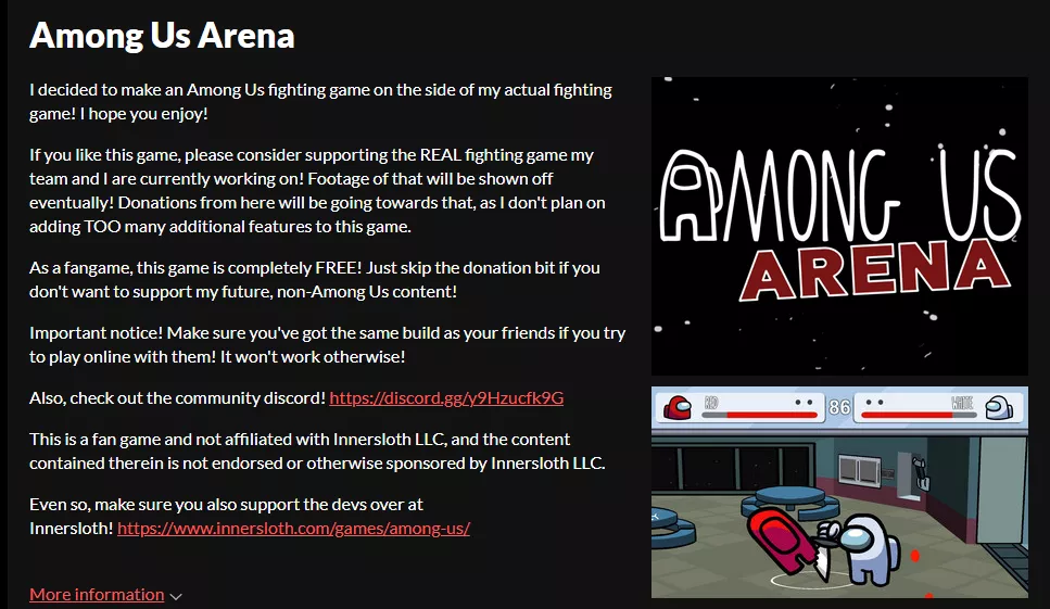 這部遊戲被定名為《Among Us Arena》,是給船員們準備的格鬥競技場,使用Unity引擎製作,在itch.io網站上提供免費下載。