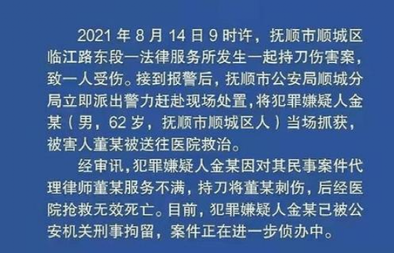 就在僅一個月前,8月14日,遼寧撫順,一位60歲男子持刀在一法律服務所內,將一名女律師連捅三刀,女律師經搶救無效死亡。而兇手,就是這名女律師的委託人,作案的動機主要是認為女律師代理的他的民事案件耗時太久,而產生不滿。