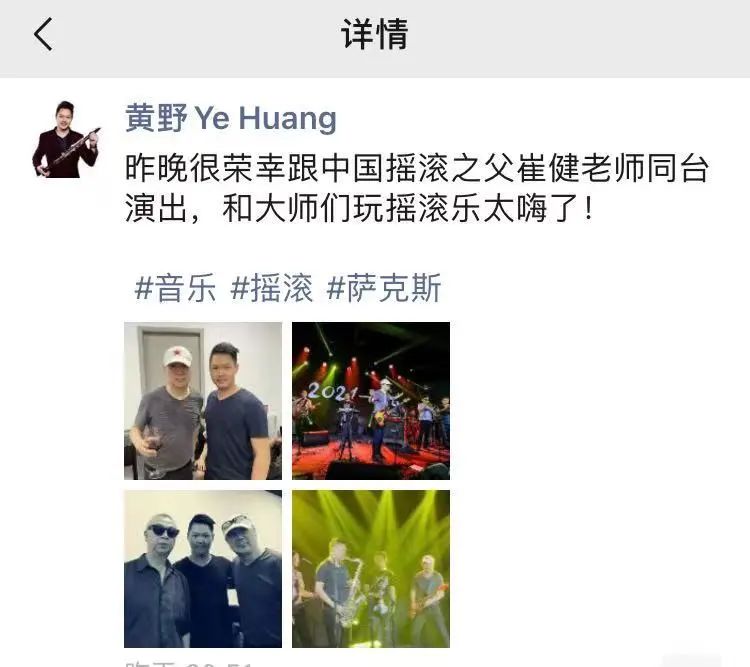 點開他的朋友圈,最新一條是和崔健同台演出後的合影。
