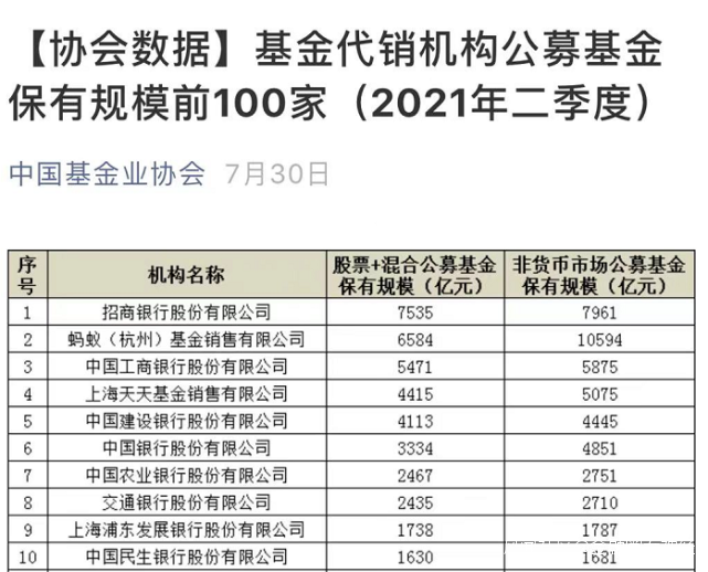 基金業協會數據顯示,從權益類基金保有規模排名看,招商銀行、螞蟻、工商銀行分列前三位;從非貨幣基金保有規模排名看,螞蟻在二季度首次突破萬億元。