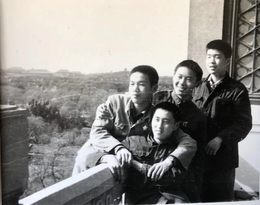 70年代30號新樓樓頂,背景有故宮、景山、北京飯店。照片上從左到右為榮海京、林鐵、袁克西、何小明,都是幹校回來的,在招待所住過近十年。
