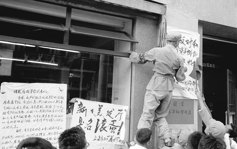 1966年8月,上海紅衞兵在南京路上張貼大字報