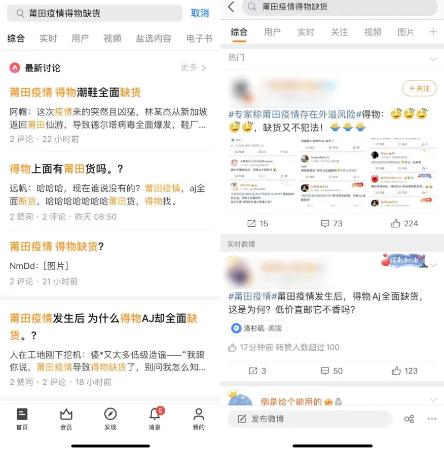 近幾天,90後李安安發現,身邊的朋友對#莆田疫情得物缺貨或漲價#的話題議論不止。在微博、知乎、抖音等社交平台,燃財經發現,該話題也引發了不少網友的討論。有網友發佈的抖音視頻顯示,在其核酸檢測時,發現一米隔離帶使用的是得物APP的膠帶。