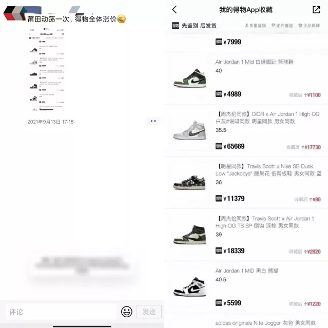 有網友曬出其在得物APP上的商品收藏記錄表示,自己收藏的“Nike Air Force 1 Low shadow雙鈎” 女款鞋子從2630元漲至3599元。