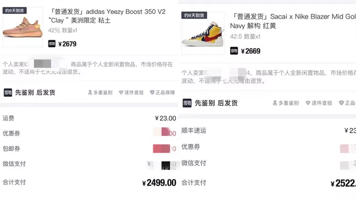 李安安曾是得物APP的買家,先後兩次在得物APP下單買了sacai x Nike聯名款和Yeezy美洲限定款,在一系列優惠之後分別花費了2522元和2499元。