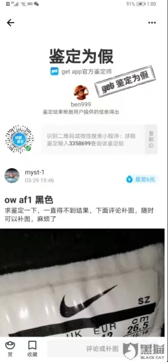 該用户寫道,自己在2019年3月28日在得物APP購買了一雙Off-White x Air Force 1鞋款,之後發現鞋子與另一雙在日本官網買到的同款鞋子鞋型區別過大。於是便在三個國內大的鑑定平台去鑑定。得到的結果是,得物APP的鑑定師全部給到了無法鑑定;get APP的四位鑑定師均給到鑑定為假的結果;知解APP的鑑定師也給到了一個鑑定為假的結果。但得物APP的專員告訴該用户他們只認可他們自己平台的鑑定結果。