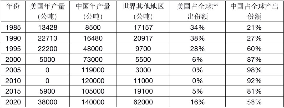 美國、中國稀土金屬年產量以及其分別佔全球產出份額