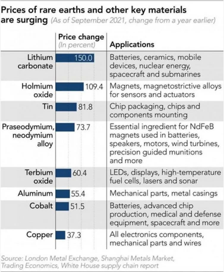稀土金屬中漲幅最大的是鈦,它被用於製造傳感器和執行器的磁鐵和特殊合金,在過去一年裏,它的價格翻了一倍。而用於製造揚聲器、電機、風力渦輪機等設備中強磁鐵的釹和鈀的價格同比上漲了73%以上。