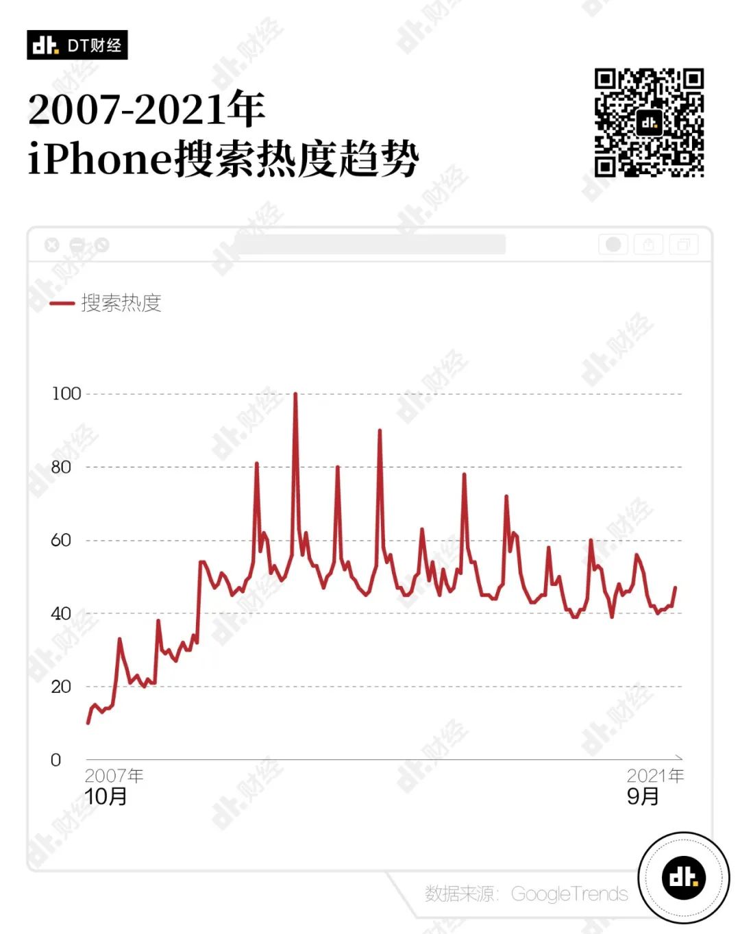 在谷歌搜索引擎上可以看到,這些年蘋果發佈會的關注度越來越低,自2012年發佈iPhone 5之後,一直在下跌。