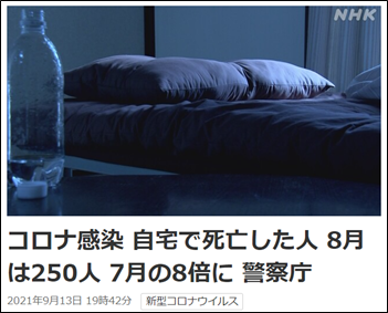 今年7月下旬某晚,東京都(市)內有位50餘歲男性因呼吸困難呼叫救護車,救護車出動很快,但在接上病人後,聯繫100餘家醫院卻均被拒絕接受,病人在救護車上竟然苦等8個多小時!而這根本不是個例。據日本總務省消防廳統計(日本救急歸消防部門管),僅今年7月最後一週,全日本就共發生698件救護車緊急般運新冠患者卻在半小時之內找不到接受醫院事件。你可以想象,會有多少人因醫治不及時而死去!多少家庭呼天天不應,叫地地無門,只能眼看着自家親人躺在家裏聽天由命,自生自滅!