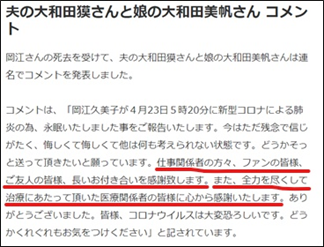 去年4月女星岡江久美子因新冠急死亡我就有些想不明白。岡江久美子是一個好感度很高的女演員,去年4月3日開始發燒,當時因為日本政府規定發燒患者必須經過保健所判斷才能去醫院接受治療。而當時判斷的標準是連續四天燒37.5度以上37.4度都不行,少一天也不行,還要有倦怠感、呼吸困難等症狀。很遺憾,有幾條岡江久美子達不到,因此只能一直在家休養,不能去醫院。等到6號病情突然轉重時,到處打電話也還是因沒有連續4天高燒而不能入院,後來家屬動用關係,好不容易才住進醫院,但為時已晚,直接進入ICU,就再也沒有出來。如此死亡,連我一個外人都看不過去,覺得有問題。可人家家屬反而在面向社會發表的談話中,感謝迄今為止對夫人有幫助的一切人,感謝努力治療夫人的醫務人員,並沒有指責任何人,當然更沒有指責政府。家屬是有名作家,你看看,這覺悟有多高!