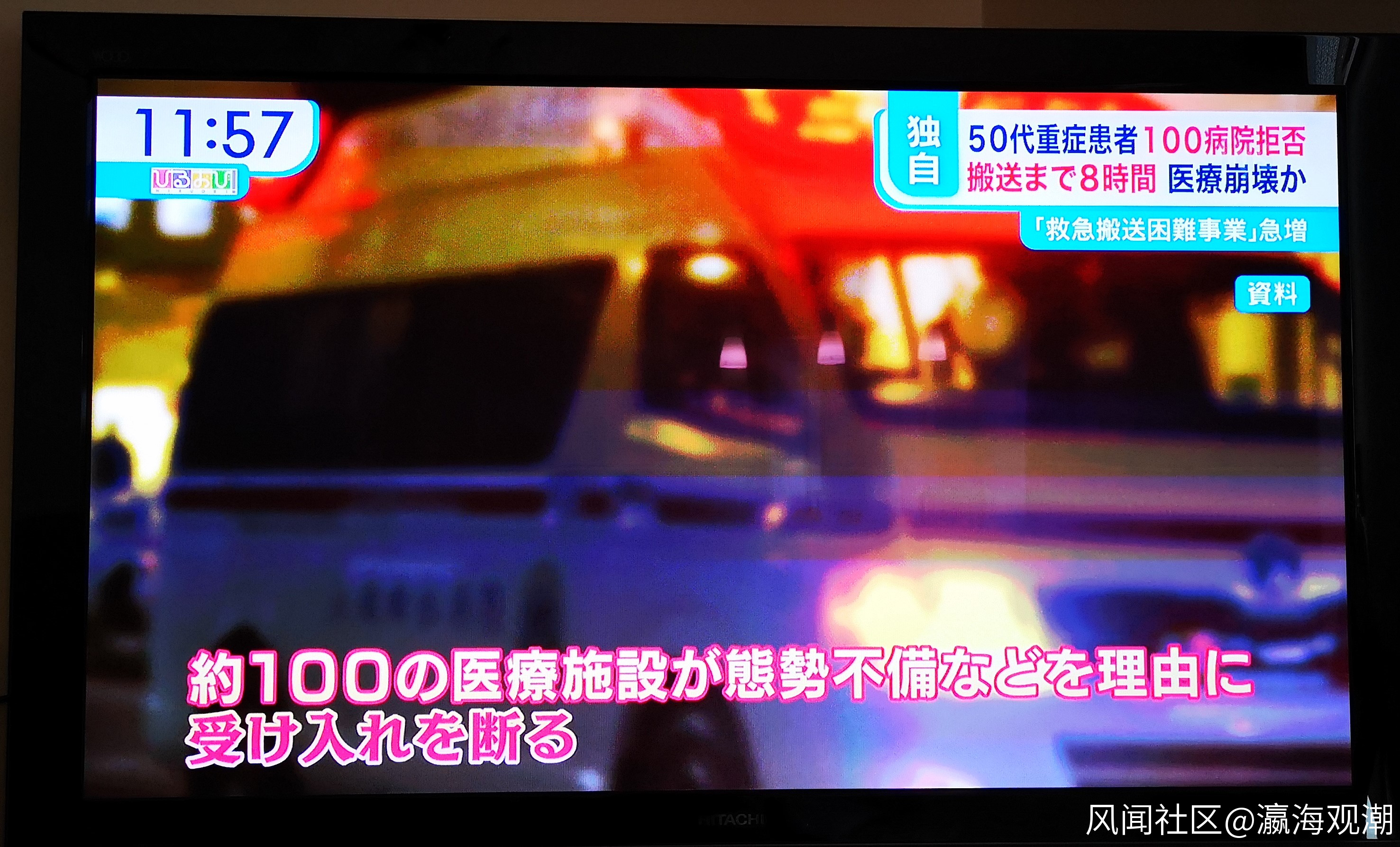電視台跟蹤報道一個同樣是50多歲單身在東京奮鬥的男人,因新冠確診一個人居家休養,體温持續高燒,血氧濃度低下,呼吸困難,病情嚴重,醫生判斷必須住院,但卻多次聯繫均被被保健所以無牀位為由而拒絕。此人已經生活不能自理,只能把在鄉下的老母親叫來。可憐的老母親,對着電視鏡頭,對着來出診的醫生哀求:求求你們了,那怕在醫院的走道里也行,讓我兒子住院吧!可是,當然的,沒有保健所同意,他兒子是住不了醫院的,老人只能痛苦地看着兒子躺在榻榻米上急促呼吸。