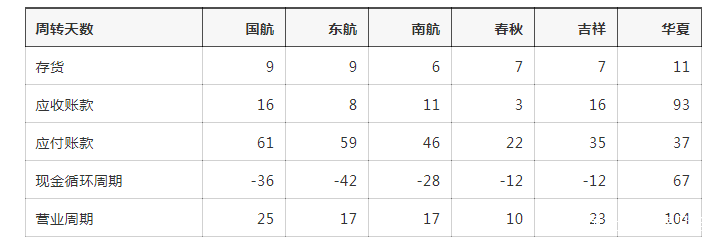 可以看見,華夏航空公司的現金循環週期(67 天)被 93 天的應收賬款週期(等於存貨週期 + 應收週期 - 應付週期)大幅度拖累。與其它航空公司一般可以預收晚付(應收賬款週期小於應付帳款週期,現金循環週期為負數)不同,華夏航空由於其營業結構的原因,呈現出明顯的預付晚收的趨勢。