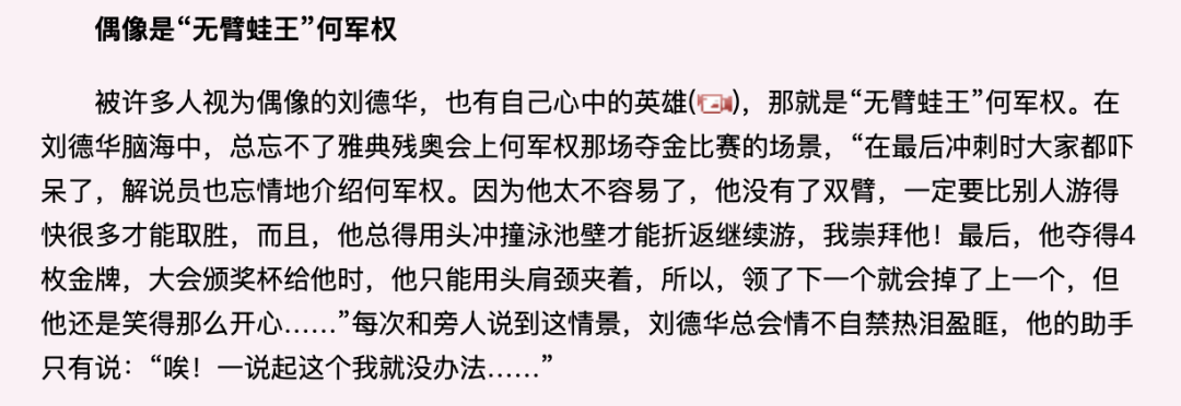 在之前很多采訪中,只要劉德華被問及“最喜歡哪位運動員”一類的問題,他的回答幾乎都是一個叫做“何軍權”的無臂游泳運動員。