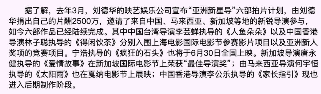 2005年的時候,劉德華投資了2500萬片酬搞了一個“亞洲新星導”計劃,其中,林子聰、甯浩、李公樂、李芸蟬、何宇恆、唐永健等六位年輕導演都是此項計劃的扶持者。