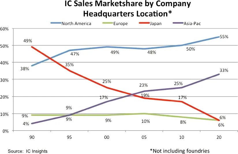 然而日本半導體的發展曲線卻出現了轉折,從1990年開始,日本半導體的市場份額一路走低,到2020年已至6%。對於這一結果不能解釋為台積電太強了,因為1990年台積電的產量還很小,不足以產生這麼大的效應。除了以中國台灣為代表的亞太地區,北美地區的市場份額也在同步攀升。