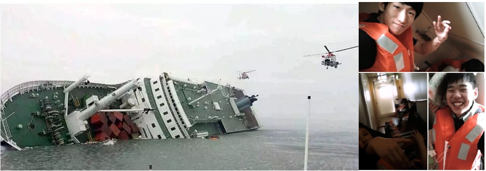 世越號傾斜的狀態,此時學生們還在互拍照片,態度輕鬆表明當時情況並不嚴重