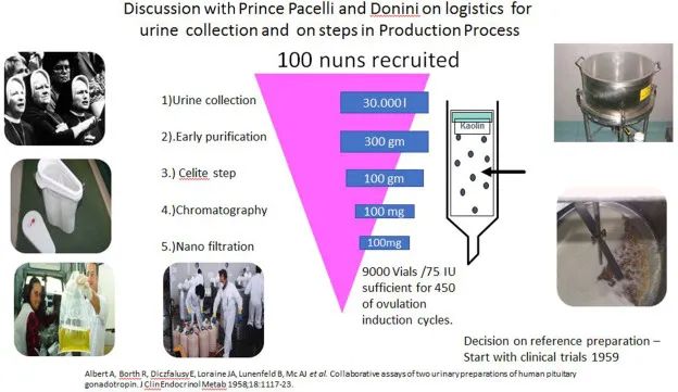 Lunenfeld 回憶,當時在董事會會議上,Pacelli 對董事們説:“我的叔叔教皇皮烏斯十二世決定幫助我們,他讓安養院的修女們每日為了神聖的事業採集尿液。”就這樣,用女性尿液提純激素的項目啓動了。