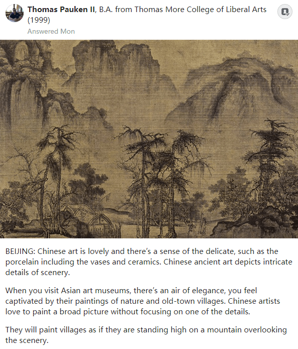 北京:中國的藝術很可愛,能給人一種精緻的感覺,比如瓷器,包括花瓶和陶瓷。中國古代的藝術描繪了複雜的風景細節。