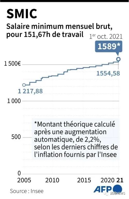 而INSEE週三公佈的數字顯示,通貨膨脹指數自2020年11月以來上升了2.2%,因此,法國最低工資將在10月1日自動增加,根據法新社的計算,每月增加近35歐元(税前)。目前每月最低工資為1554.58歐元(税前),10月起將提高到1589歐元左右,每小時最低工資將從10.25歐元提高到10.48歐元。