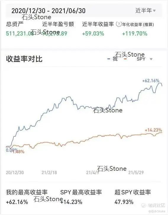 也有人因為盈利獨樹一幟。暱稱“石頭Stone”的用户在7月初發了一篇上半年交易覆盤的帖子,本來是給自己做個筆記,沒想到帖子火了。他的突然走紅,是因為他上半年高達62%的收益率。