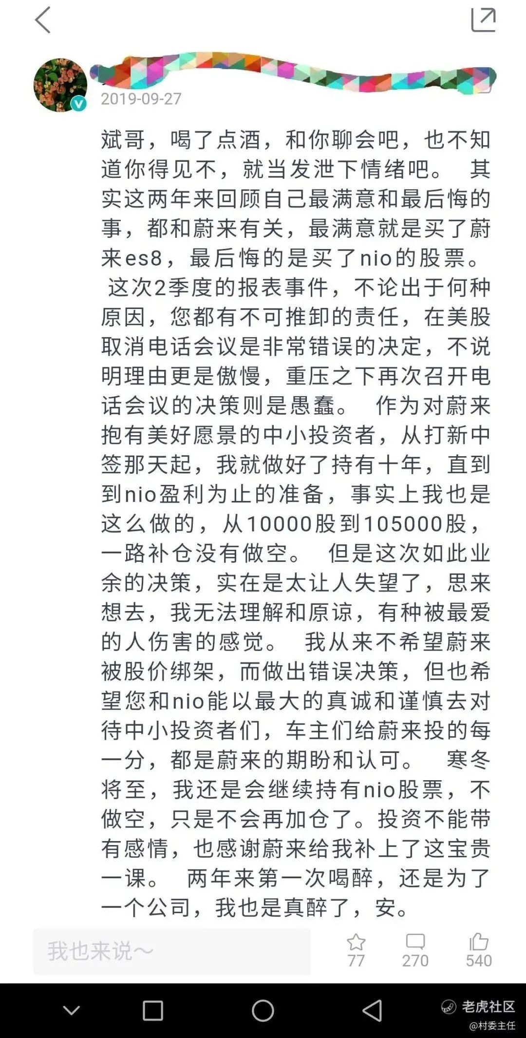 坊間是各種唱衰蔚來的消息,聽得多了,村委主任會在老虎證券的社區上試圖反駁,更多的時候他會發些自己對蔚來的想法。“我希望朋友們對蔚來再耐心一點,不要因為一點波動就大呼小叫。”帖子裏,村委主任不斷強調,在那段困難期這幾乎變成他的口頭禪。