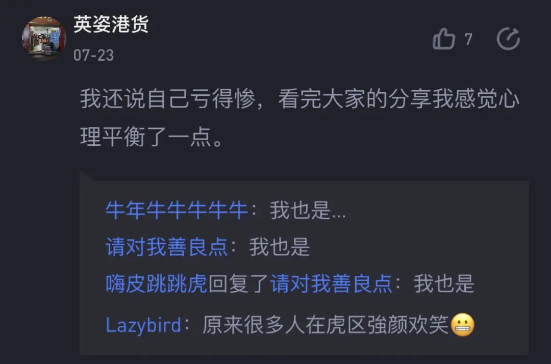 在港美股互聯網券商老虎證券的社區裏,“比慘大會”已經辦到了第6屆。用户們在評論區發帖曬單,放出慘不忍睹的收益圖,在線比慘。