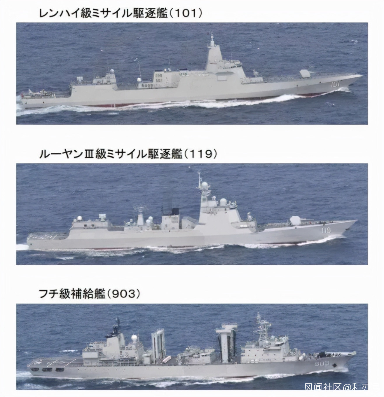根據美國海岸警衞隊發佈的照片顯示,出現在美軍鏡頭前的,起碼有三艘中國海軍的艦艇,一是作為編隊指揮艦的、北部戰區海軍某驅逐艦支隊下屬的055型大型驅逐艦首艦101號“南昌”艦,二是北部戰區海軍某驅逐艦支隊下屬的052D型驅逐艦119號“貴陽”艦,三是某戰鬥支援艦支隊所屬的903號快速戰鬥支援艦。