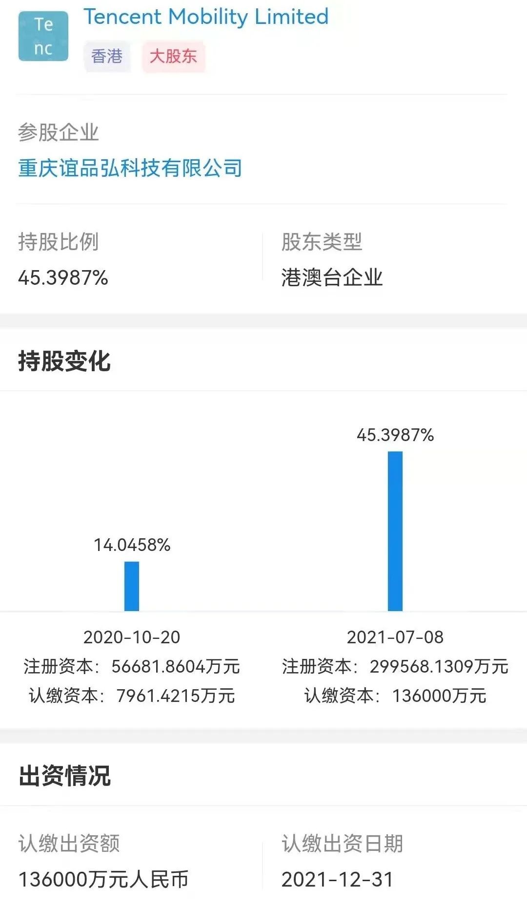 根據誼品生鮮所屬公司——重慶誼品弘科技有限公司工商資料顯示,在2021年7月,誼品生鮮擴大了一次註冊資本,從5.67億元大幅擴至29.96億元。騰訊的認繳資本則從2020年10月的7961萬元,增至13.6億元。騰訊成為了誼品的最大股東,持股比例高達45.4%。