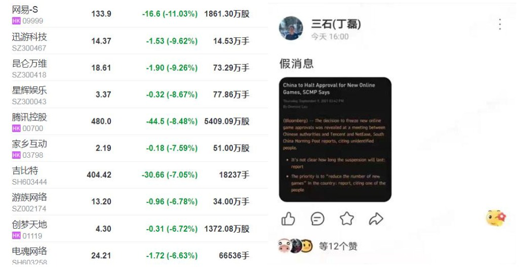 此消息一出,使得遊戲股持續走跌。9月9日港股收盤時,網易跌幅超過11%,為跌幅最大成分股。此次暴跌,除了官方部門的約談,也與《華南早報》在9日下午放出消息,有知情人爆料國內將暫停網絡遊戲的審批工作不無關係。雖然網易CEO丁磊對其消息的闢謠圖早早被傳出,但是也並沒有能挽救得了網易的股價。