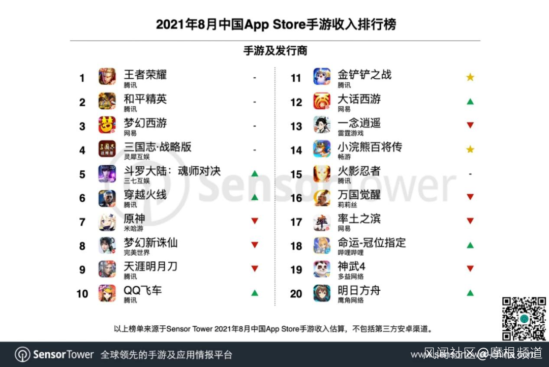 9月8日,Sensor Tower發佈8月中國APP Store手遊收入排行,收入前十名的遊戲中,網易僅有一款《夢幻西遊》上榜,位列第三。而騰訊前十佔據一半席位,分別是第一的《王者榮耀》、第二的《和平精英》、第六的《穿越火線》、第九的《天涯明月刀》、第十的《QQ飛車》,還有一款憑藉着6天收入拿下第十一位的英雄聯盟雲頂之弈授權的自走棋手遊《金剷剷之戰》。