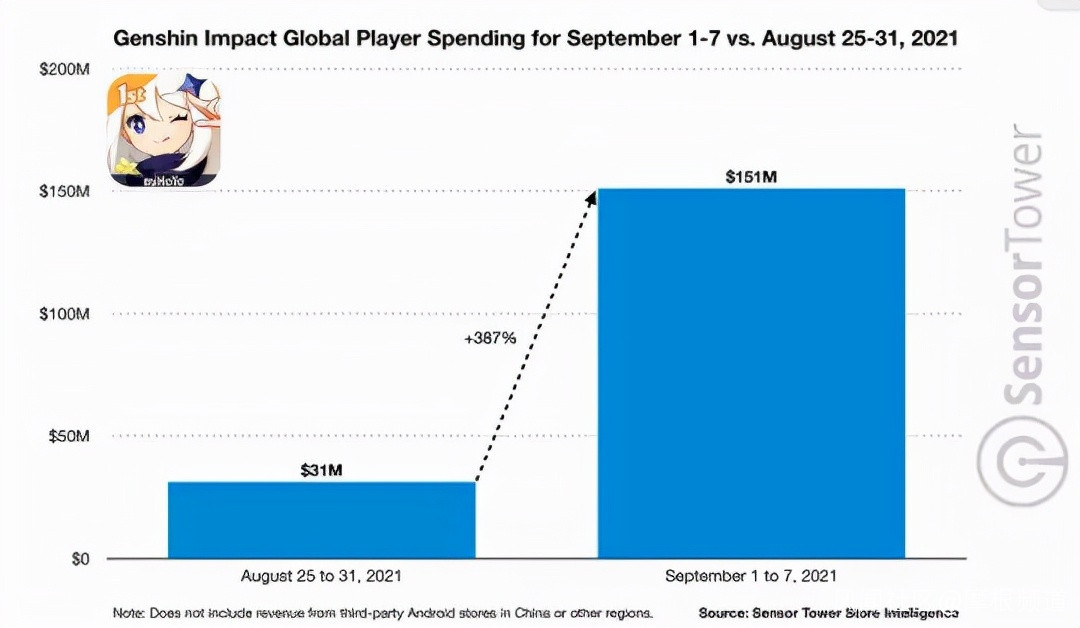 9月份一週年慶典《原神》2.1版本上線後,僅7天其移動端(不包括第三方安卓商店數據已經達到了1.51億美元。而由Sensor Tower估計,迄今為止《原神》在APP Store 和Google Play商店的全球總收入已經接近19億美元,約合120多億人民幣。