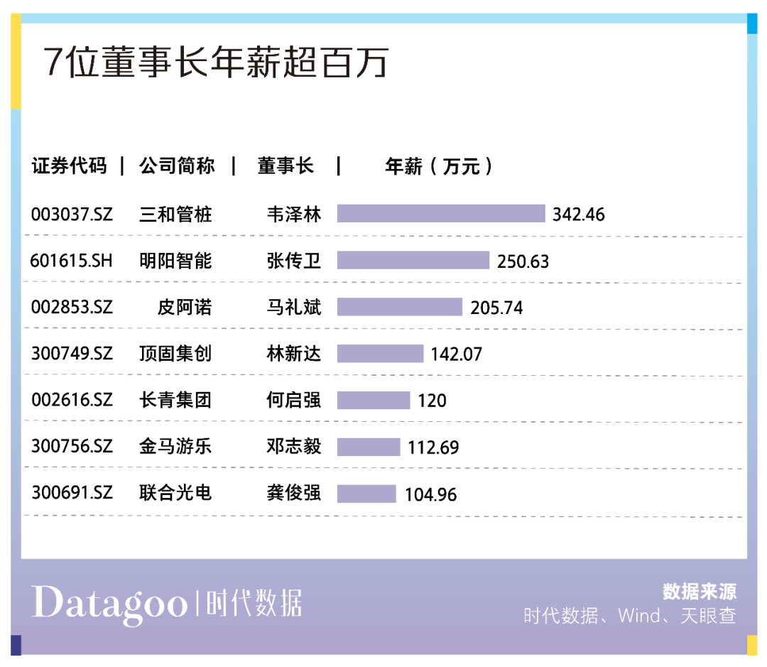 據時代數據統計,在這23家公司中,有7家公司的董事長2020年年薪超過100萬元。其中,三和管樁(003037)董事長韋澤林年薪342.46萬元,位列第一;明陽智能(601615)董事長兼總經理張傳衞年薪250.63萬元,位列第二;皮阿諾(002853)董事長兼總經理馬禮斌年薪205.74萬元,位列第三。