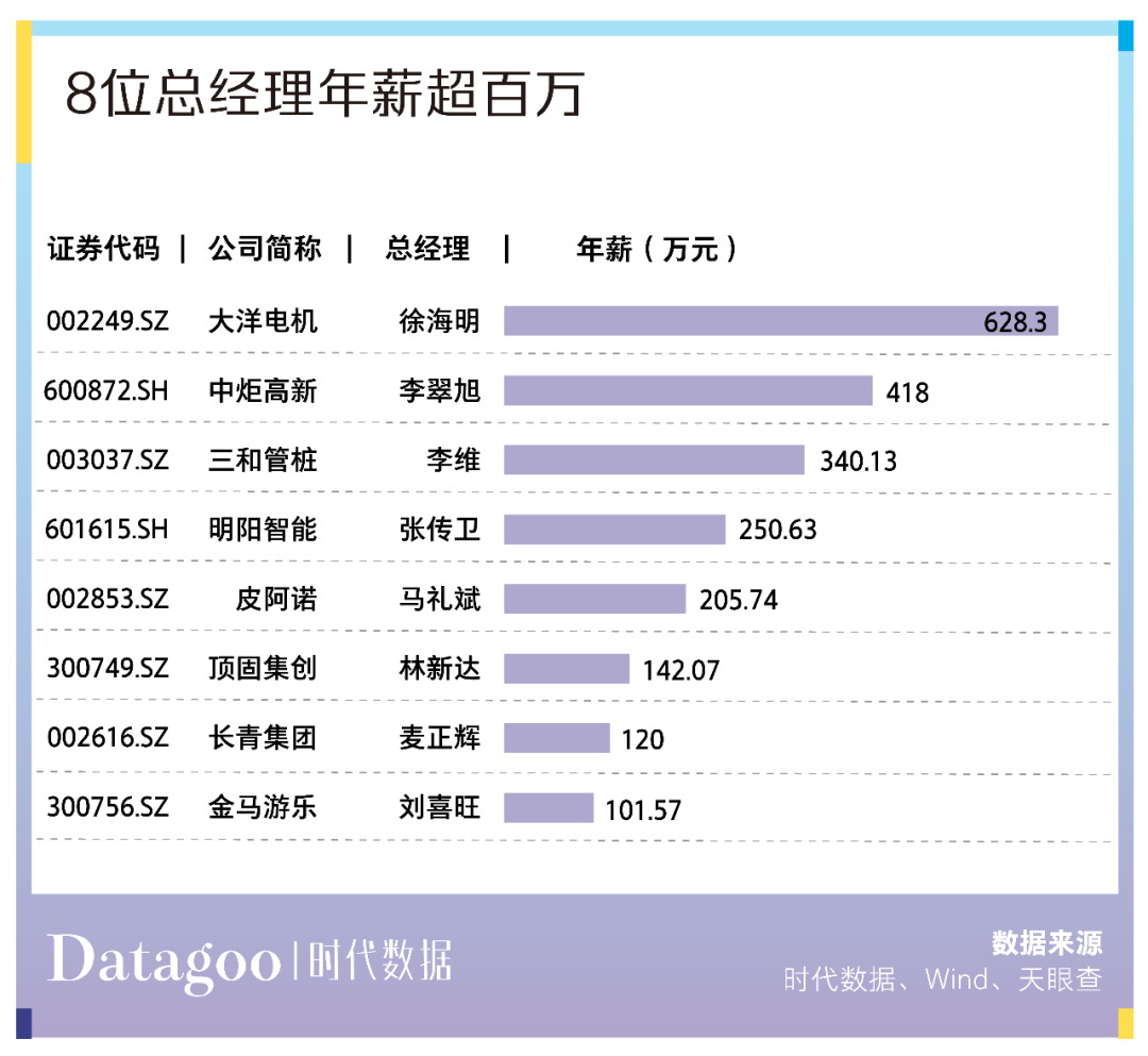 據時代數據統計,在這23家公司中,有8家公司的總經理2020年年薪超過100萬元。其中,排在第一的是大洋電機(002249)總經理徐海明,年薪高達628.3萬元;其後,中炬高新(600872)總經理李翠旭以418萬元年薪排在第二,三和管樁(003037)總經理李維以340.13萬元年薪排在第三。