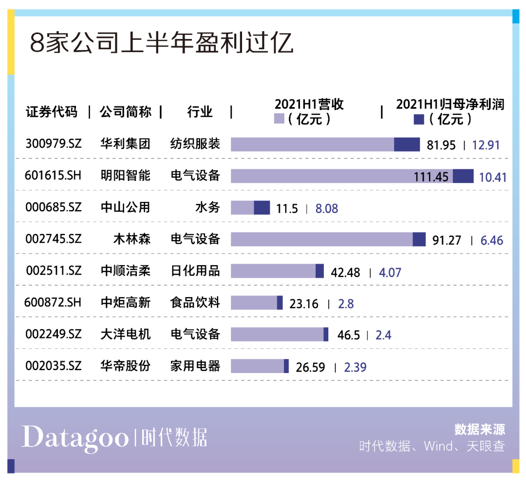 其中,華利集團(300979)上半年業績高居第一,上半年營收81.95億元、歸母淨利潤12.91億元。其後,全球頂級的風機製造商和清潔能源整體解決方案提供商明陽智能(601615)上半年營收111.45億元、歸母淨利潤10.41億元,位列次席;以環保水務為核心業務的中山公用(000685)上半年營收11.5億元、歸母淨利潤8.08億元,位列第三。