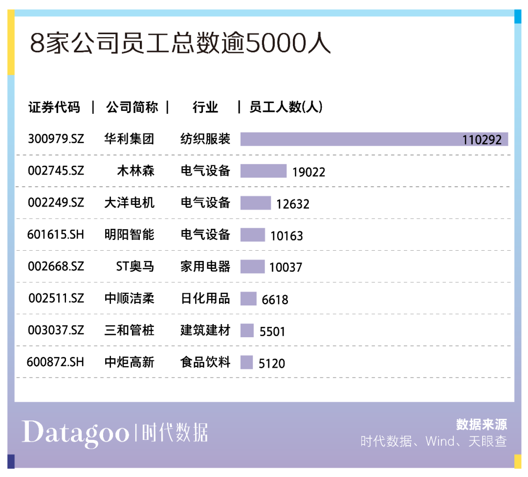 其中,全球領先的運動鞋專業製造商華利集團(300979)創造的就業崗位雄踞第一,擁有員工約11.03萬人;其後,全球LED封裝行業領先企業木林森(002745)擁有員工約1.9萬人,排在第二;全球電機及驅動系統行業領先企業大洋電機(002249)擁有員工約1.26萬人,排在第三。